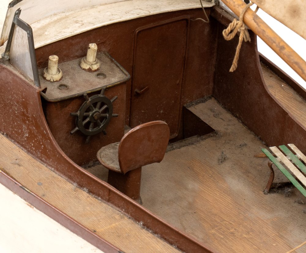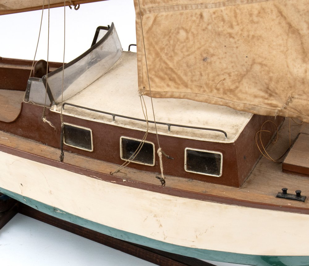 cm 90x130 Modello di imbarcazione cabinata in legno su base in mogano. Condizioni accettabili, lievi danni alla chiglia.