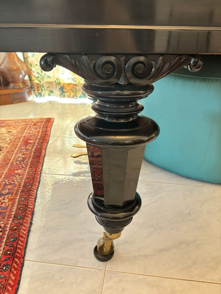 237 cm Pianoforte Bechstein nero con finitura lucida, gambe tornite provviste di rotelle, tastiera a 88 tasti originali in avorio, leggio traforato e decorato con volute, ottime condizioni.