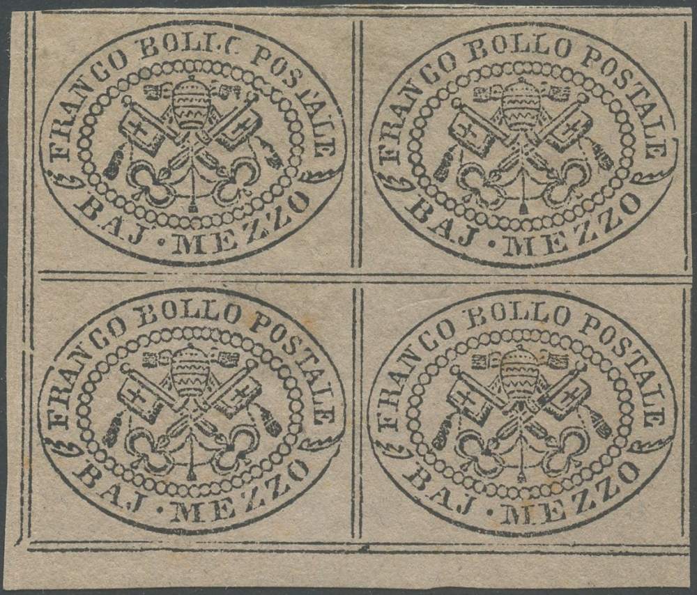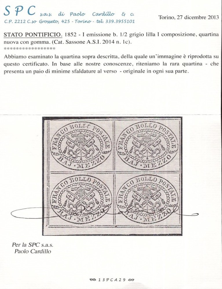 1852 - 1/2b. grigio lilla n. 1c in quartina di cui due valori con punto chiaro. Cat. 7.500. (A/B) (cert. Cardillo)