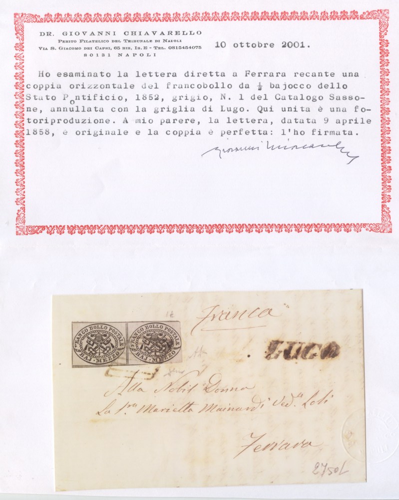 10.04.1856 - lettera da Lugo per Ferrara affrancata per 1baj tramite una coppia del 1/2 baj. grigio n.1. Cat. 2.500++. (A) (Alberto Diena, Certificato Chiavarello)