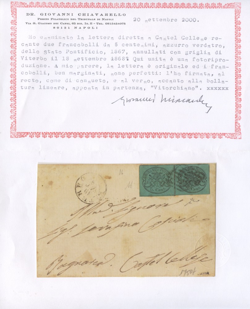 1867 - lettera spedita da Vitorchiano per Castel Cellese ed affrancata tramite due valori da 5 cent. azzurro verdastro n.16. Sul retro lo Stampatello diritto di Vitorchiano (11 pt.). Cat. 4.850. (A) (Cert. Chiavarello, Alberto Diena)
