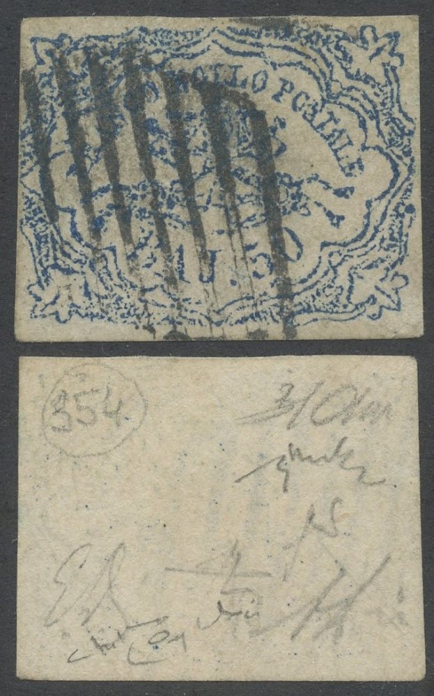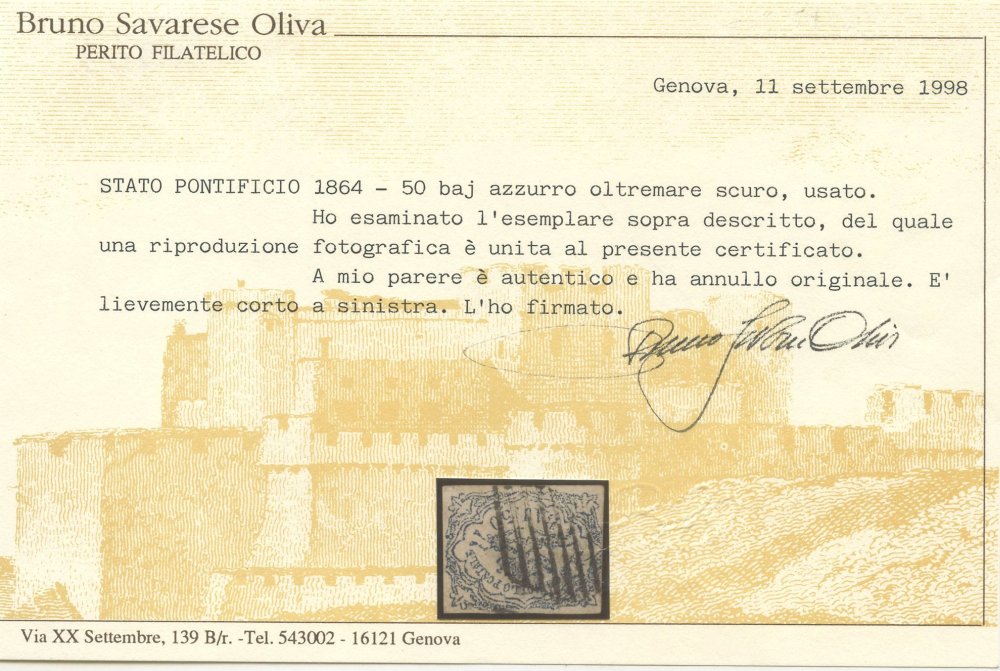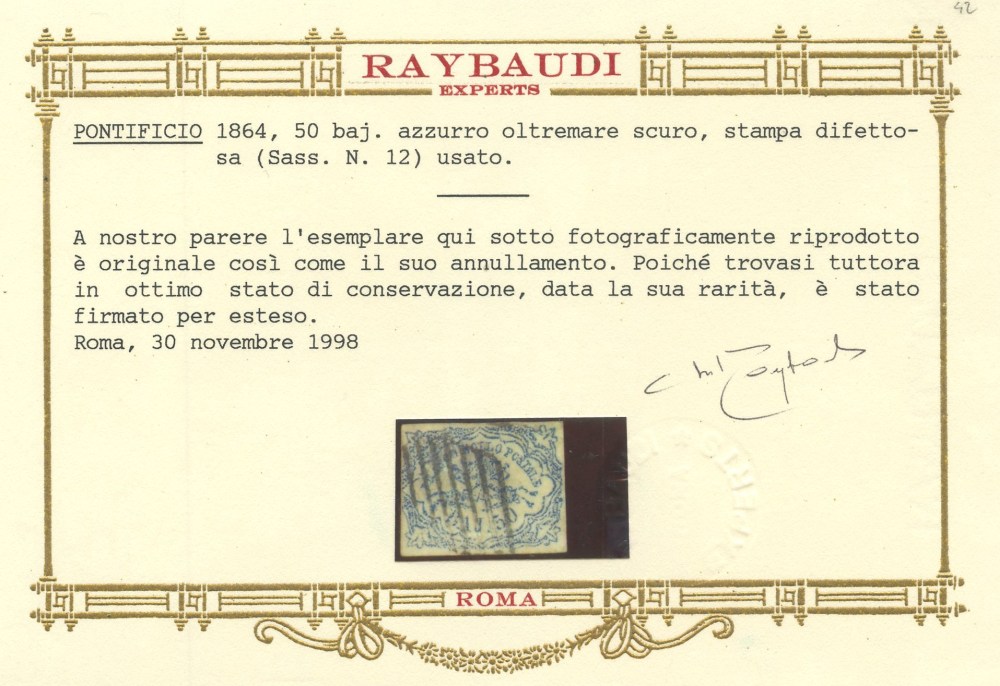 1864 - 50 Baj. azzurro oltremare scuro con stampa difettosa n.12, usato. Tre grandi margini e a filo a sinistra, ottimamente conservato. Il raro francobollo è accompagnato da tre certificati e plurifirmato dai periti dell'epoca. Occasione. Cat. 7.500. (A-) (Cert. Raybaudi, Cert. Fiecchi, Cert.Oliva, Emilio Diena, Alberto Diena, Chiavarello)