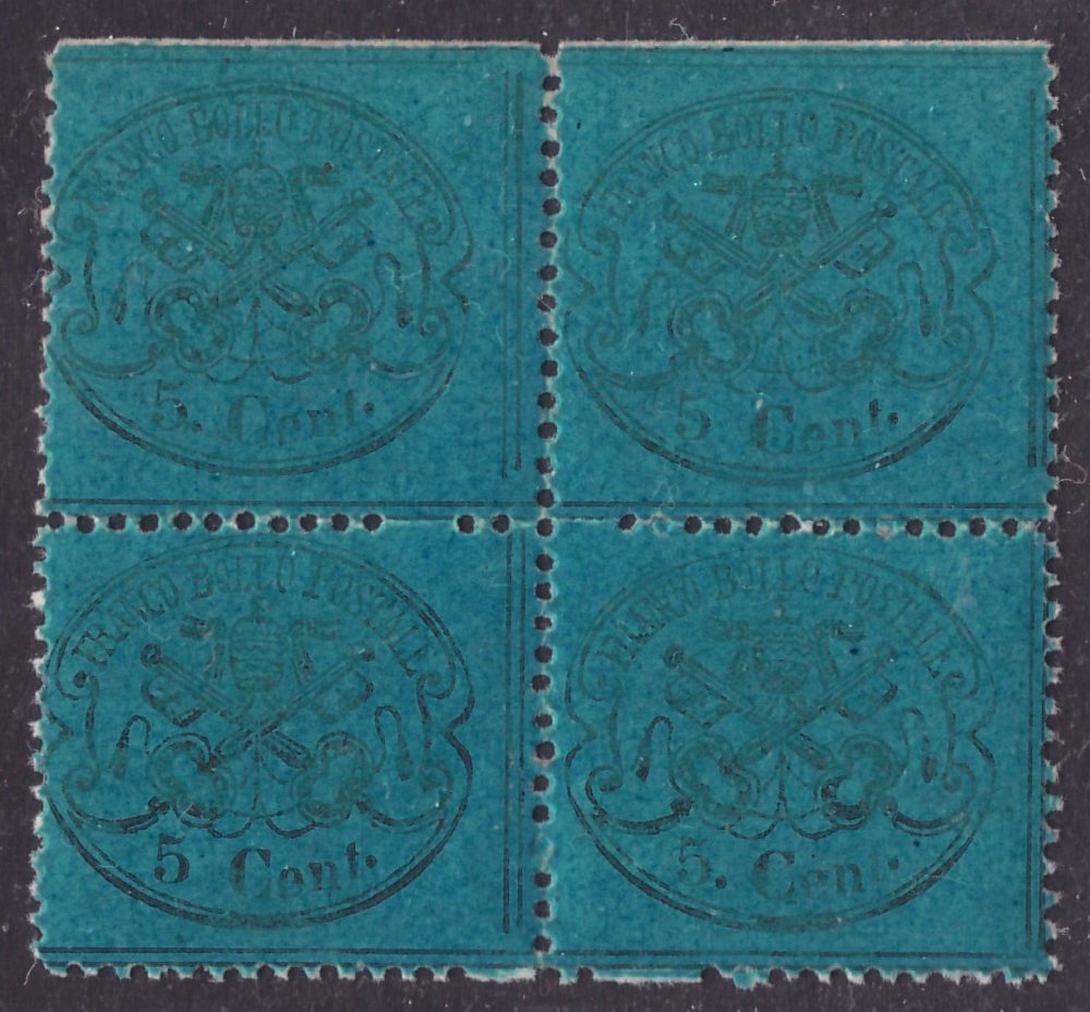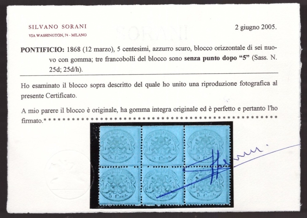 1868 - 5 cent. azzurro scuro in splendida quartina di cui due esemplari con la varietà ''senza punto dopo la cifra'' n. 25d + 25dh, nuova con gomma integra. Cat. 30.000++. (A+) (Cert. Sorani del blocco di provenienza)