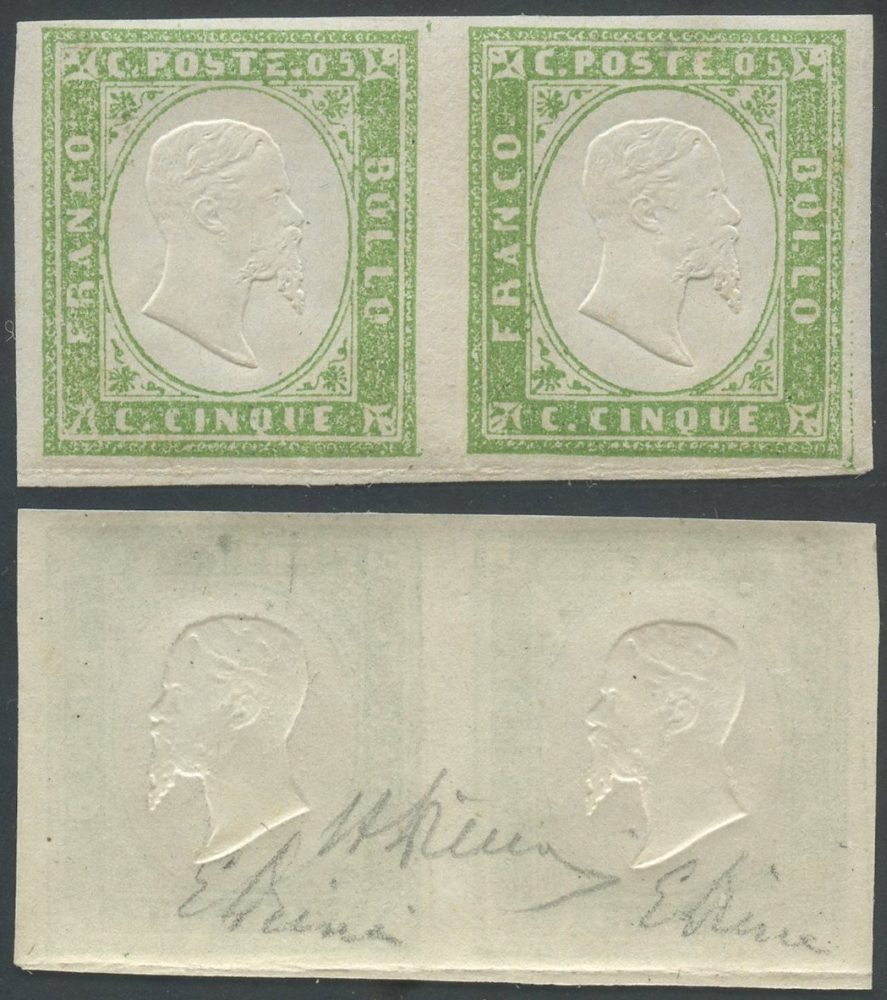 1859 - Splendida coppia del 5 cent. verde giallo tiratura del 1859, nuova con gomma integra, MNH. La coppia è firmata per esteso da Emilio Diena e Alberto Diena. (A+) (Emilio Diena, Alberto Diena)