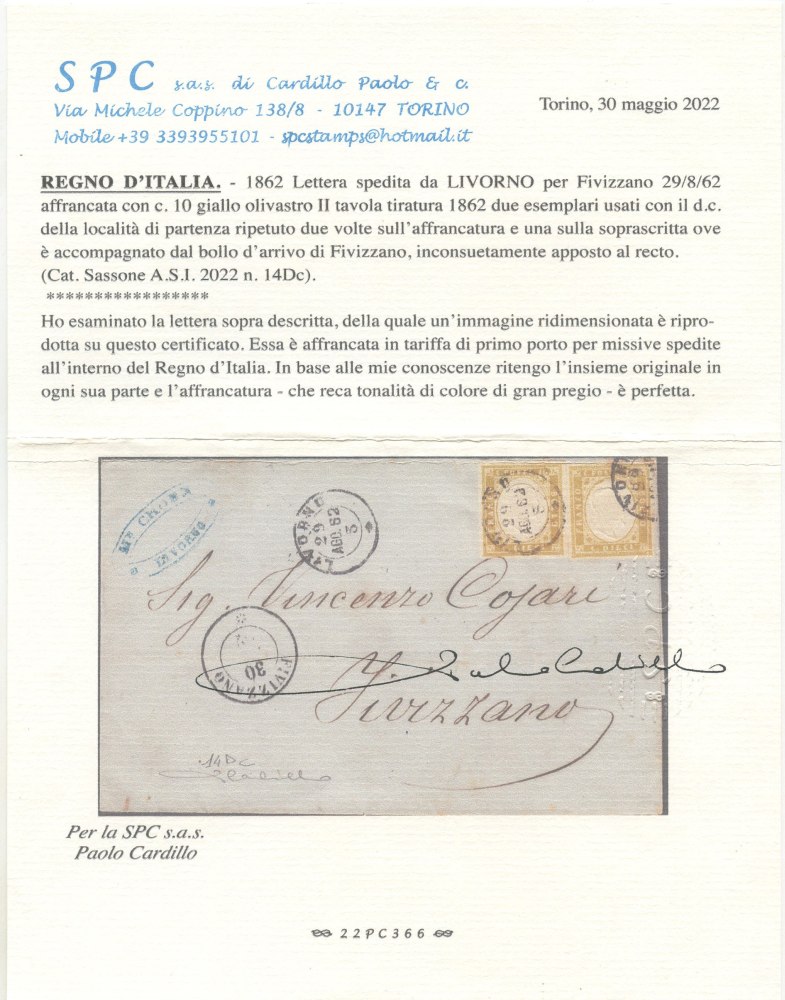 29.08.1862 - Spettacolare affrancatura di 20 centesimi composta da due valori da 10 cent. nella rara tonalità Giallo Olivastro n.14Dc su missiva da Livorno per Fivizzano dove giunse il 30.08.1862. Tale tonalità di colore è decisamente di difficile reperibilità conservata su busta, per collezionista esigente. Cat. 22.500. (A) (Cert. Cardillo)