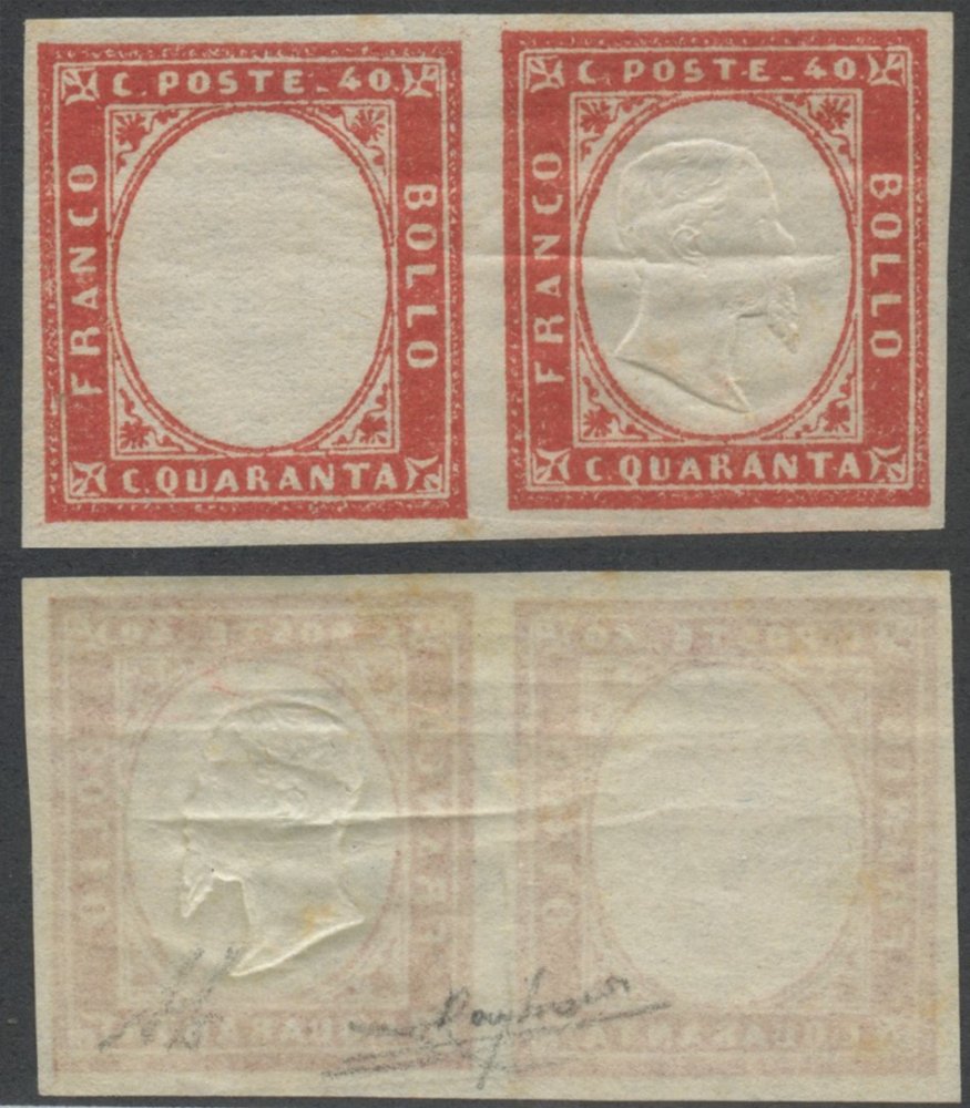 1861, 40cent. rosso vermiglio n.16Da in coppia di cui uno senza effige, nuova con gomma originale, linguellata. Grinza di gomma sull'esemplare di destra. Cat. 5.500 (per i valori più comuni). (A-) (siglato Alberto Diena, firmato Raybaudi per esteso)