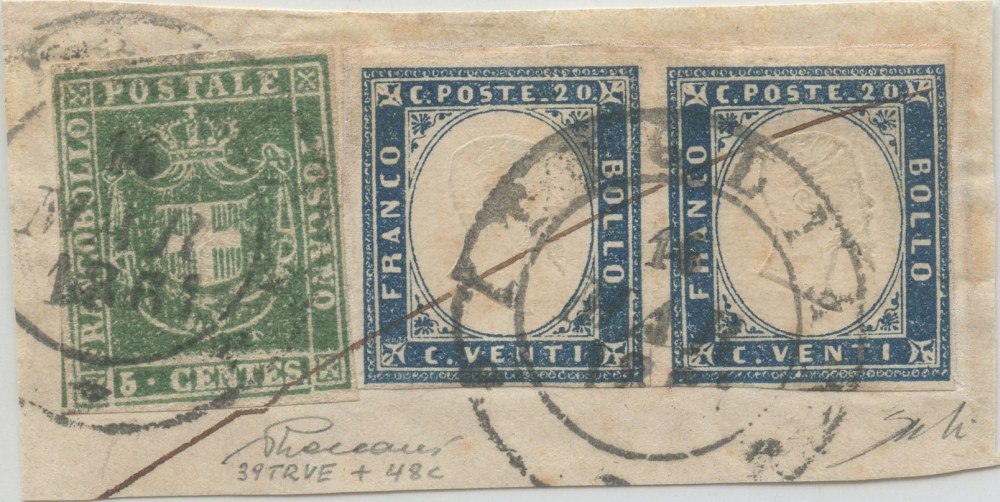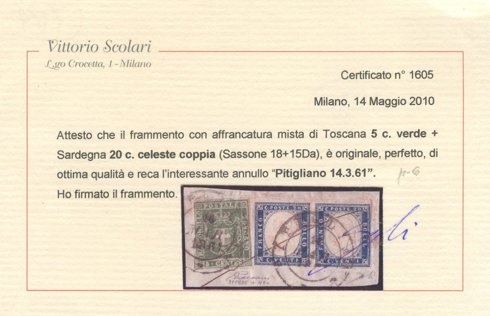 14.03.1861 - Rara affrancatura mista composta da Sardegna due valori da 20 centesimi azzurro oltremare n.15Dc e un Toscana Gov. Prov. 5 centesimi verde n.18 annullati tramite il DC di PITIGLIANO (7pt.). Entrambi i francobolli sono perfettamente conservati e ben marginati. (A+) (Cert. Scolari, Vaccari per esteso)