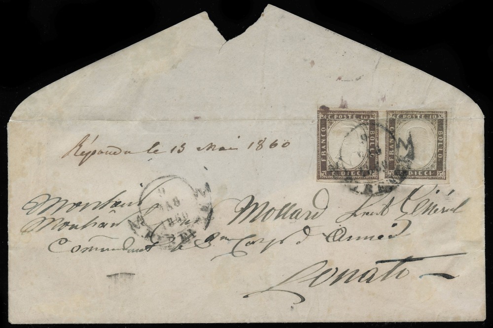 09.05.1860 - Busta spedita da Firenze per Lonato ed affrancata tramite una coppia del 10 cent. bruno porpora n.14Ac. Pur non essendo ancora stati ufficialmente distribuiti sul territorio toscano, sono noti pochissimi casi di utilizzo di francobolli sardi anteriormente alla data ufficiale della loro introduzione nel territorio toscano (1 gennaio 1861), tale utilizzo straordinario, di cui se ne conoscono solo altri 5 casi, viene spesso associato a missive spedite da o per militari; la lettera in esame risulta essere la prima a noi nota ad essere stata affrancata tramite i soli francobolli sardi. (A-)