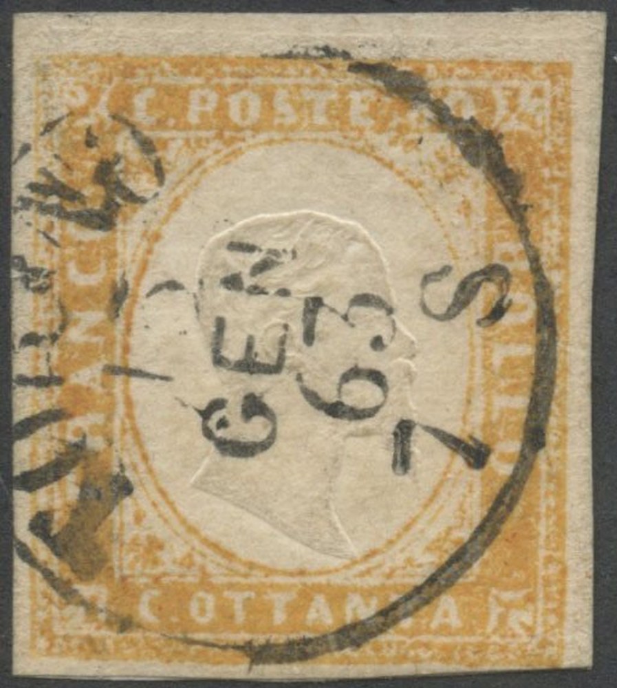 13.01.1863 - 80 cent. arancio ocra n.17b, tiratura del 1858, usato tardivamente nel 1863 a Torino. (A) (Alberto Diena)