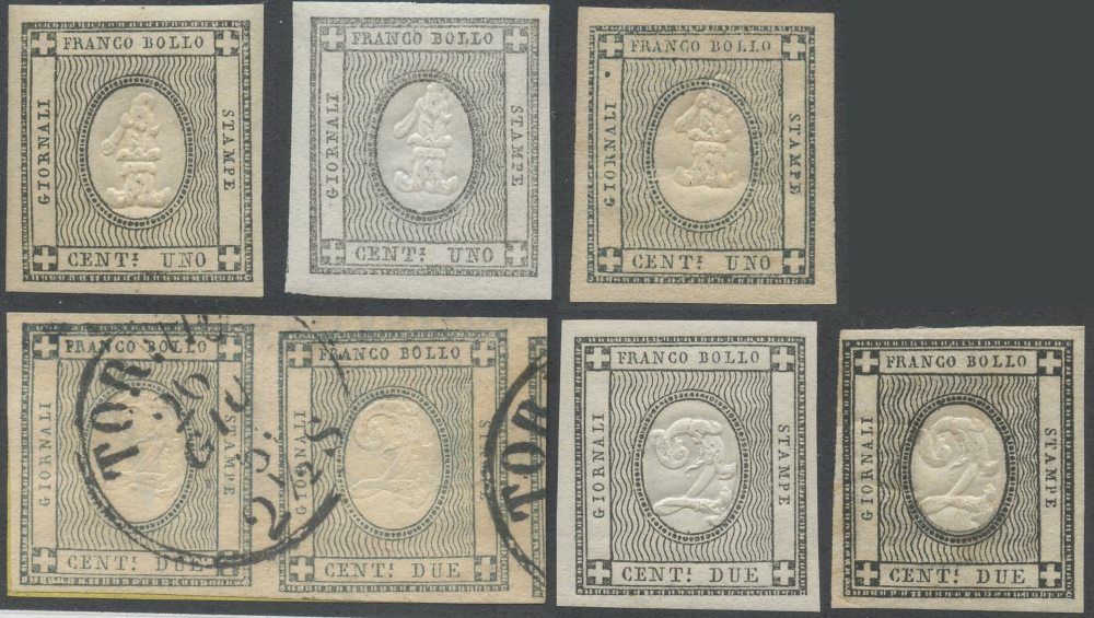 1862 - Francobolli per le stampe, 1 e 2 cent. sette esemplari tra nuovi ed usati in diverse ed interessanti tonalità di colore. Qualità in media molto buona. Da esaminare con attenzione.