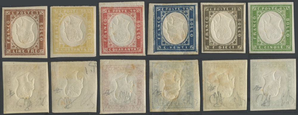 IV emissione di Sardegna con effigi capovolte postume (si consiglia un attento esame) nuova con gomma originale, MH. Tutti i francobolli sono firmati Emilio Diena. proposti e valutati come francobolli senza effige.