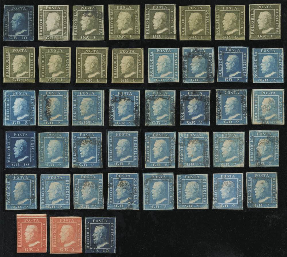 Insieme di francobolli del regno di Sicilia composto da 43 valori tra 1, 2, 5 e 10 gr. Qualità media molto alta, quasi tutti di ottima qualità. Notati numerose tonalità interessanti del 2 gr. Molto utile per lo studio dei colori o come inizio di ricostruzione di tavola.
