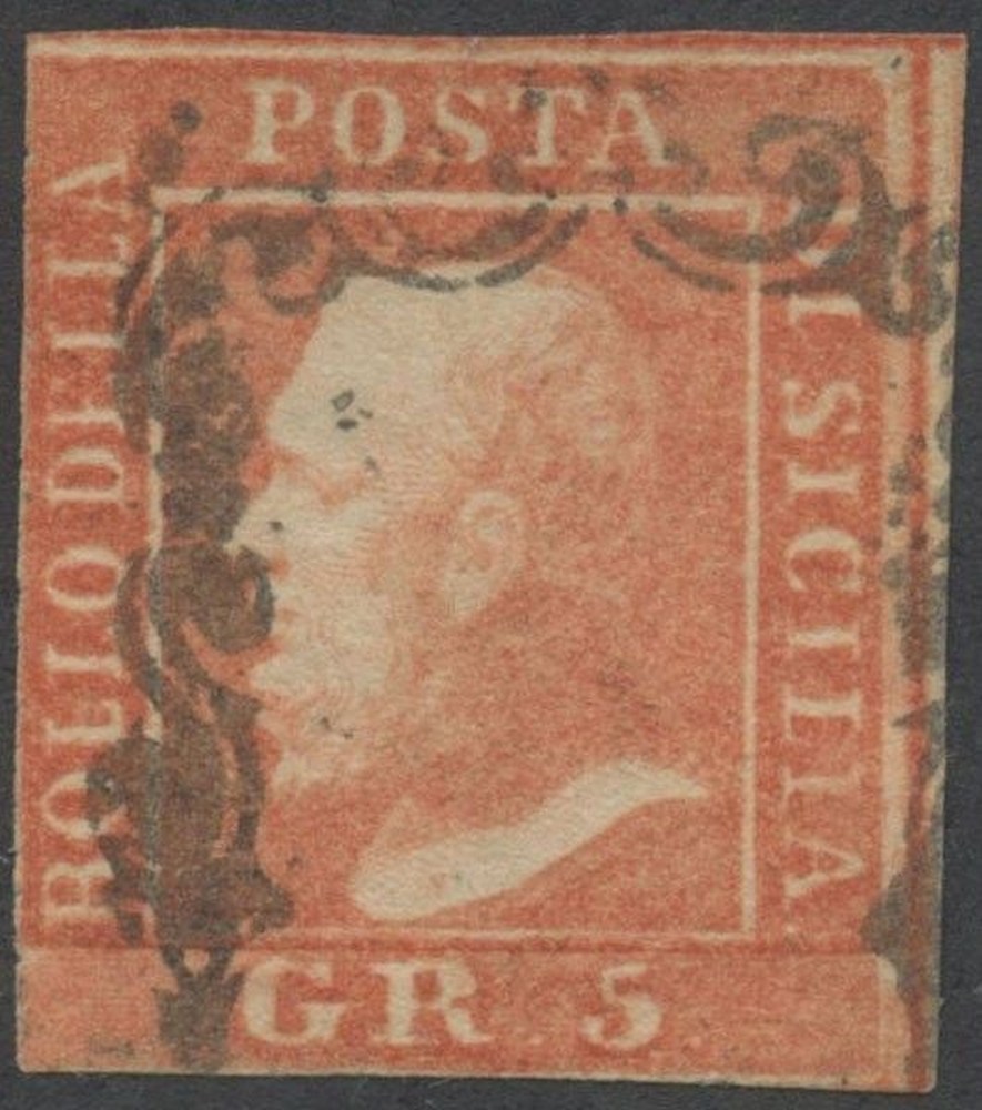 1859, 5gr. vermiglio N.10 Vermiglio chiaro, usato. Margine sinistro rasente. Cat. 5.500. (B)