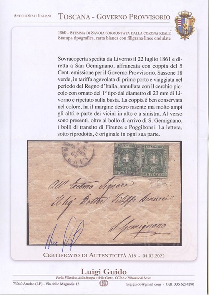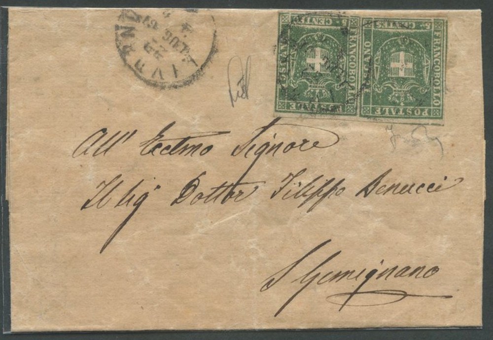 22.7.1861 - Lettera da Livorno per S. Gemignano affrancata per 10c. tramite una coppia di 5c. Verde N.18 del G.Provvisorio di Toscana viaggiati durante il Regno D'Italia. Cat. 2.700++. (A) (Cert. Luigi Guido)