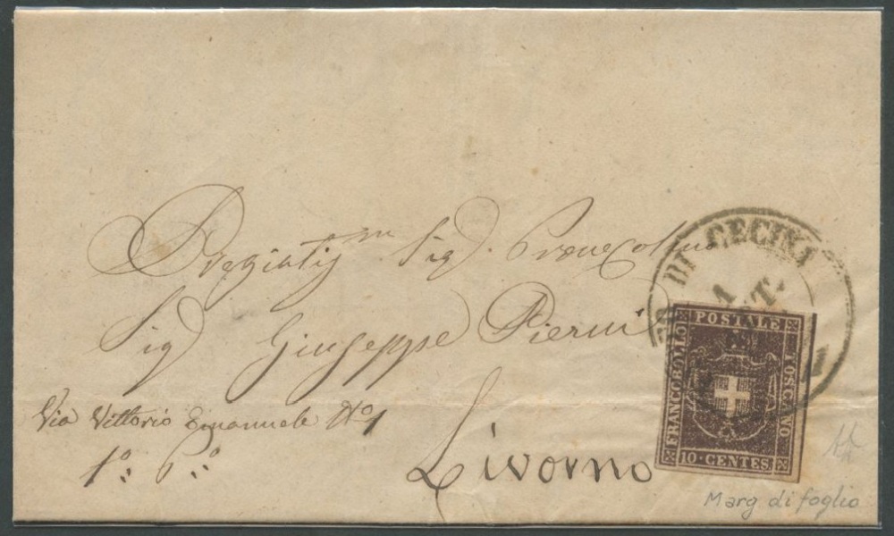 1.10.1860 - Busta da Fitto di Cecina per Livorno affrancata tramite un 10c. Bruno Scuro N.19b con linea di riquadro nel margine destro. Cat. 1.000. (A-) (A.Diena)