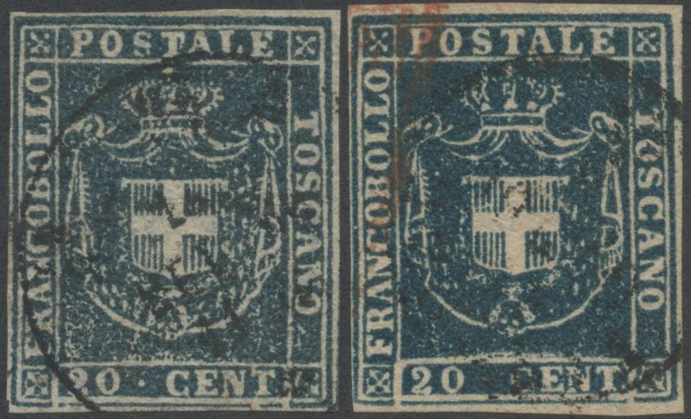 1860 - 20c. N.20 in due diverse gradazioni di colore, entrambi di ottima qualità. cat. 600. (A+)
