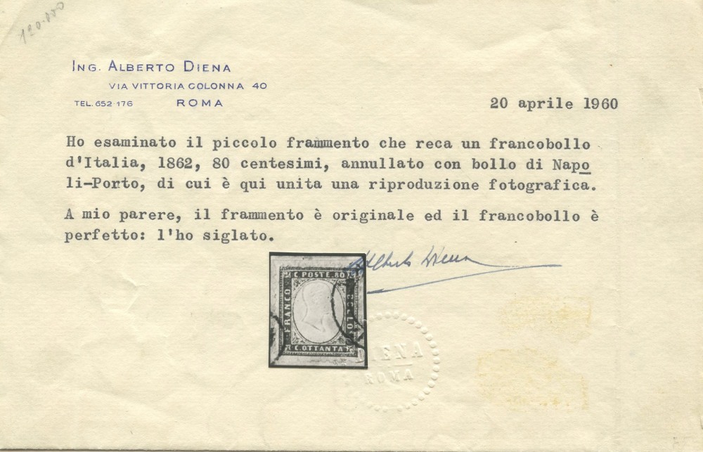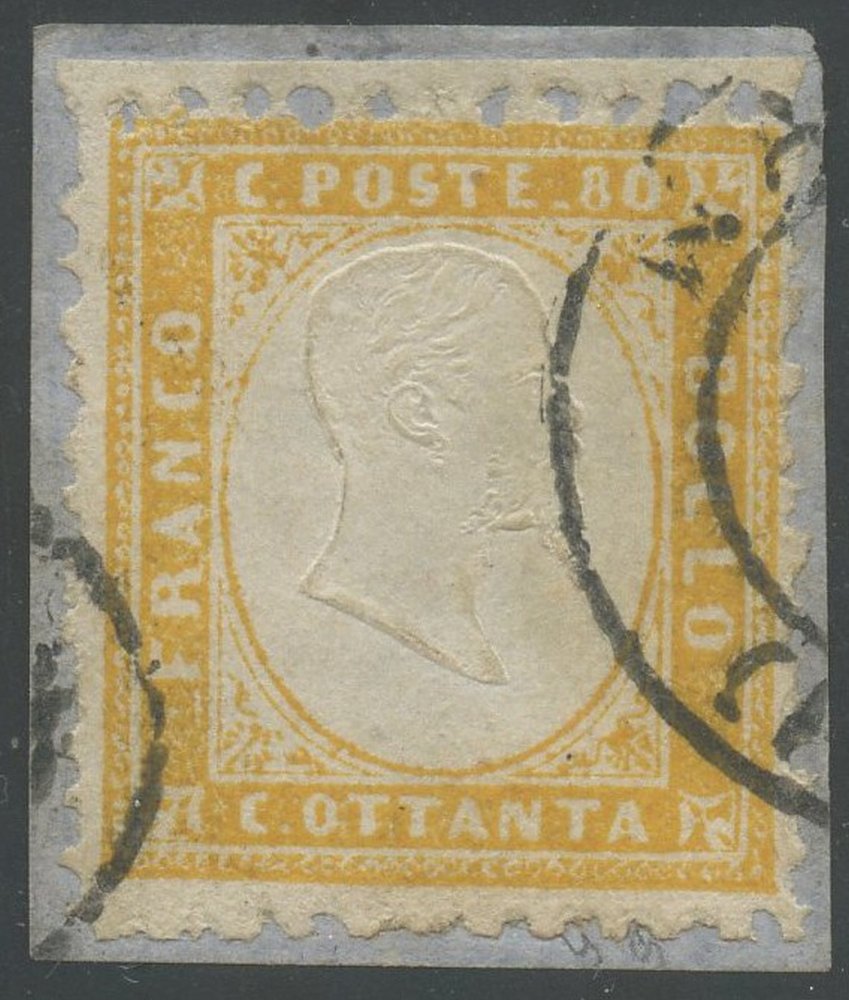 1862 - 80 cent. giallo arancio n.4, bordo di foglio in alto, usato con l'annullo di Napoli-Porto e conservato su piccolo frammento. Il raro francobollo è accompagnato da certificato storico di Alberto Diena. (A) (Cert. Alberto Diena)
