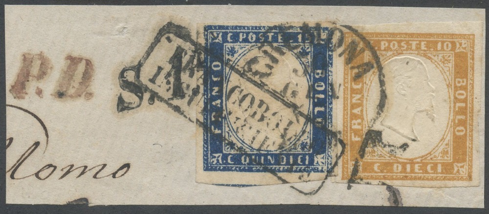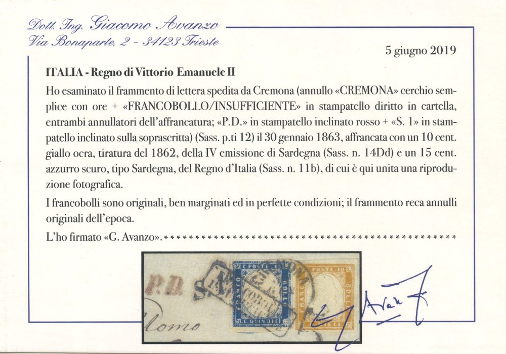 30.01.1863 - Frammento di lettera affrancato tramite Sardegna 10 cent. giallo ocra n.14Dd + regno 15 cent. litografico tipo Sardegna azzurro scuro n.11b. Sull'affrancatura il cerchio di Cremona + ''Francobollo insufficiente'' in cartella, P.D. in stampatello inclinato in rosso e S.1 stampatello inclinato in nero (pt.12). (A+) (Cert. Avanzo)