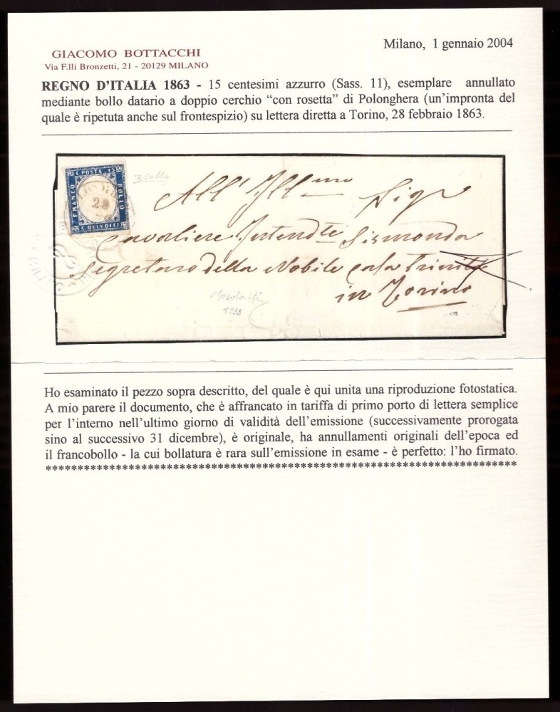 28.02.1863 - Lettera da Polenghera per Torino affrancata tramite un 15 cent. tipo Sardegna n. 11. Sull'affrancatura il DC di POLENGHERA (pt.13). (A-) (Cert. Bottacchi, Bolaffi per esteso)