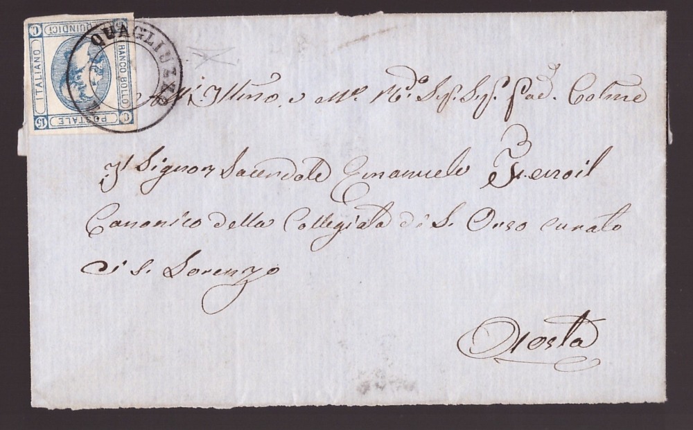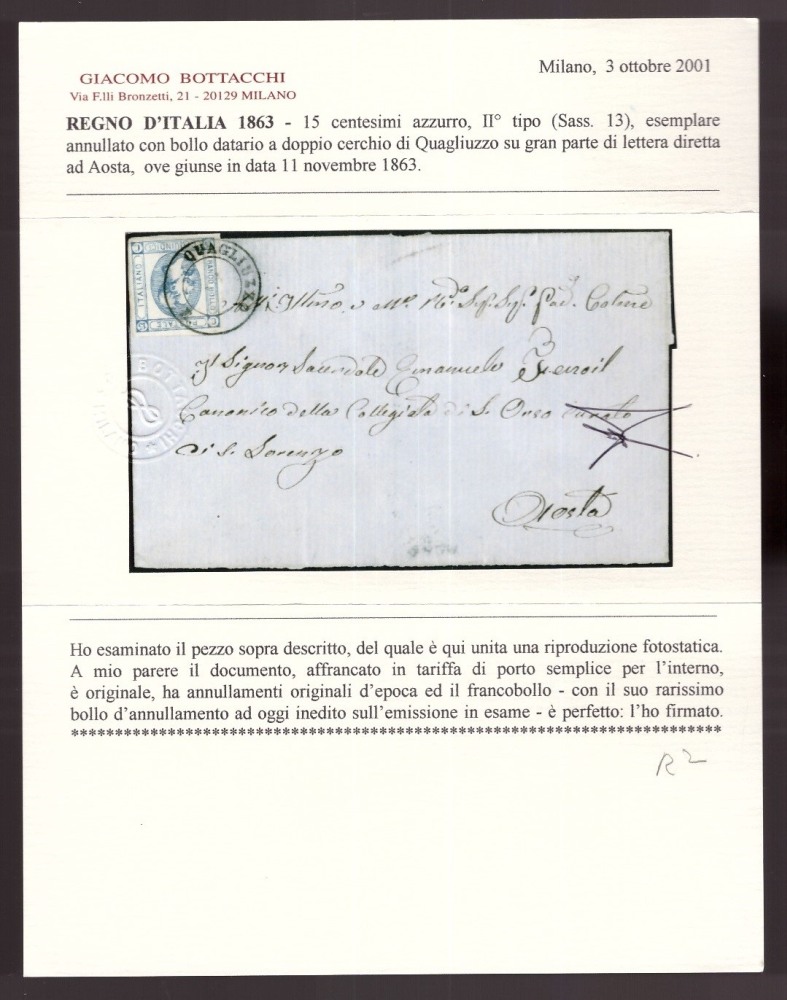 11.12.1863 - Gran parte di lettera da Quagliuzzo per Aosta affrancata tramite un 15 cent. litografico n.13. Sull'affrancatura il DC di QUAGLIUZZO (pt.R2). Cat. 25.000. (A) (Cert. Bottacchi)