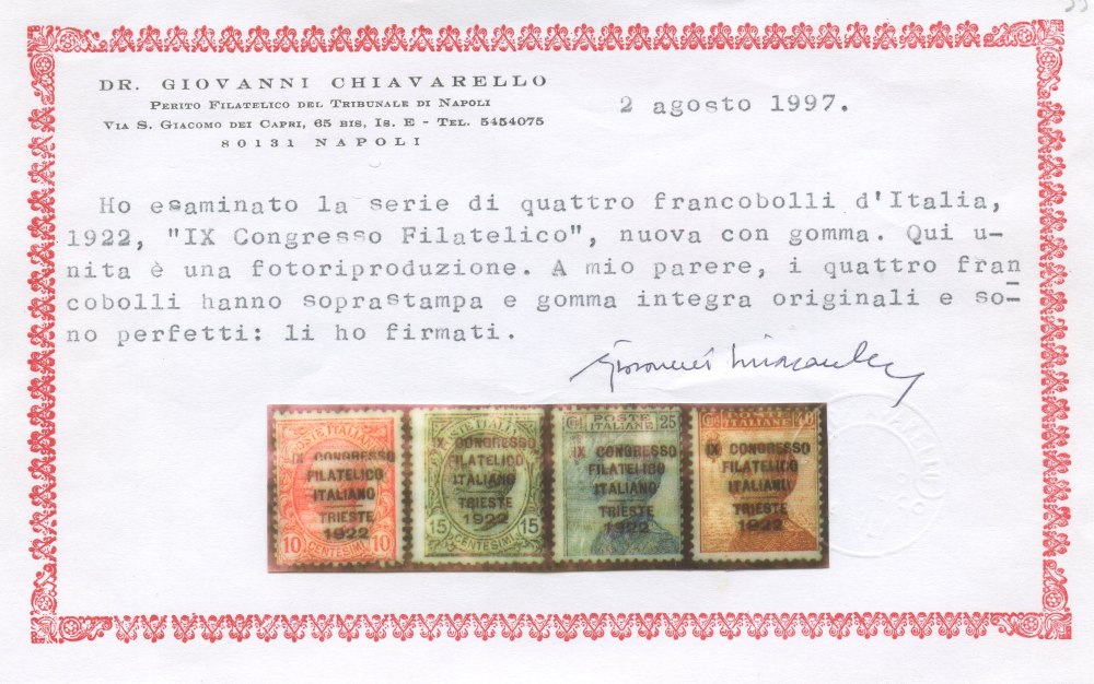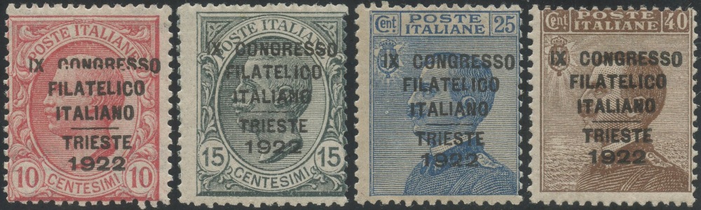 1922 - Congresso filatelico n.123/126 nuovo con gomma integra. Notata sul 10 cent. la scritta ''CONGRESSO'' incompleta, varietà inedita. (A) (Cert. Chiavarello)