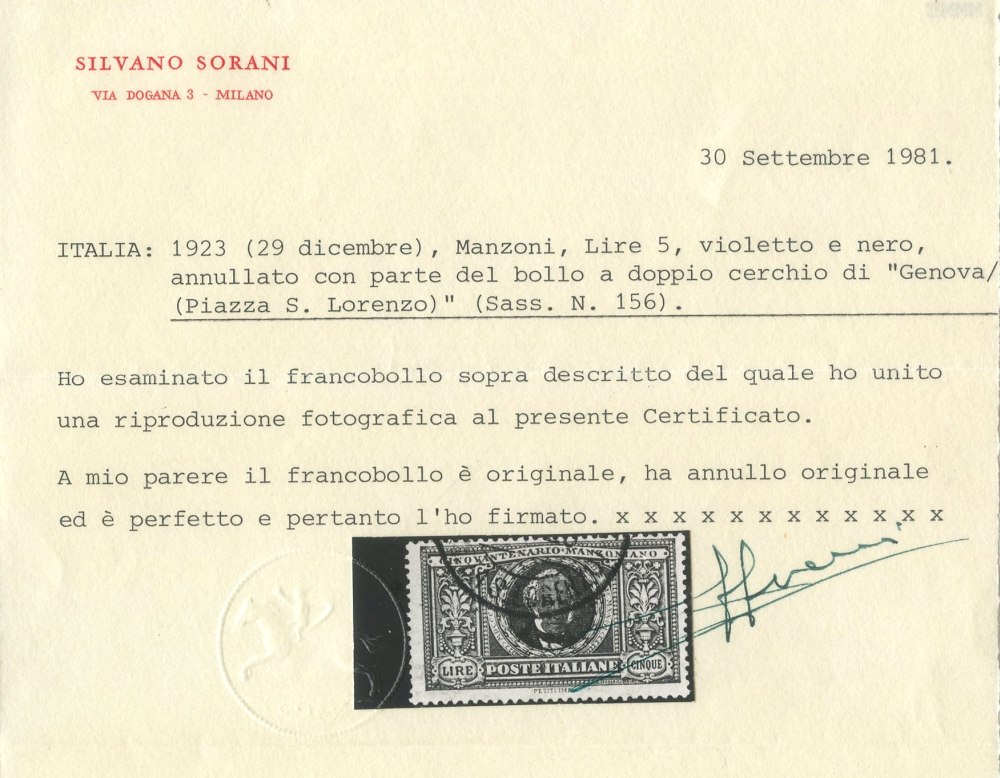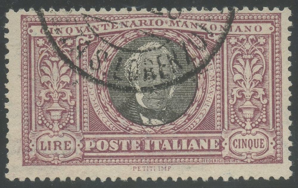 1919 - Manzoni, 5 Lire Violetto e nero n.156 usato. ottimo esemplare certificato Sorani. Uniti bassi valori con annulli non garantiti.