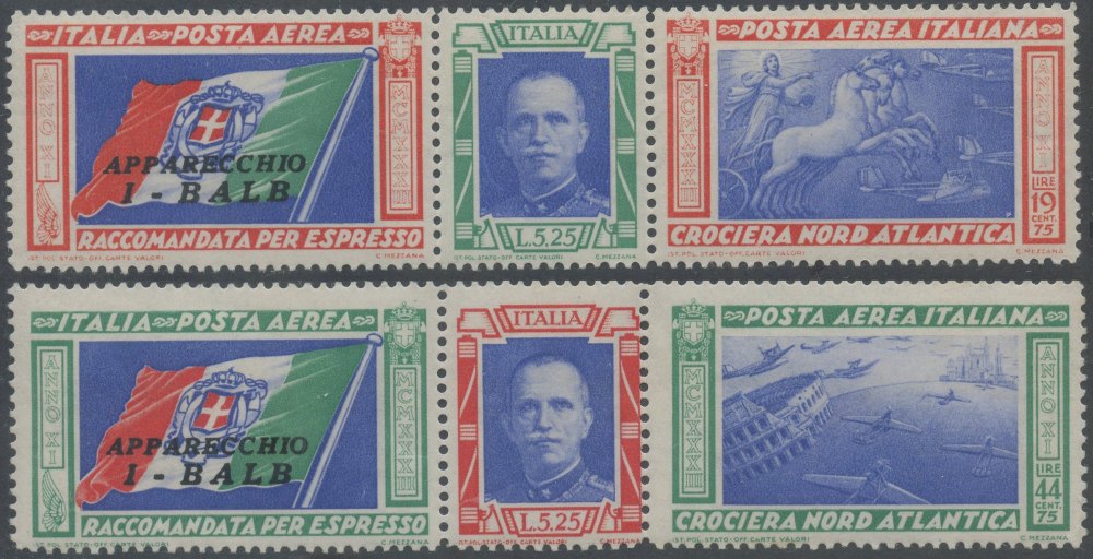 1933 - Trittici I-Balb n.51A/52A nuovi con gomma integra. Il valore da 5.25L.+44.75L. presenta la pala centrale con dentellatura verticale di destra spostata a sinistra risultando quindi più piccolo del normale. Cert. Terrachini.
