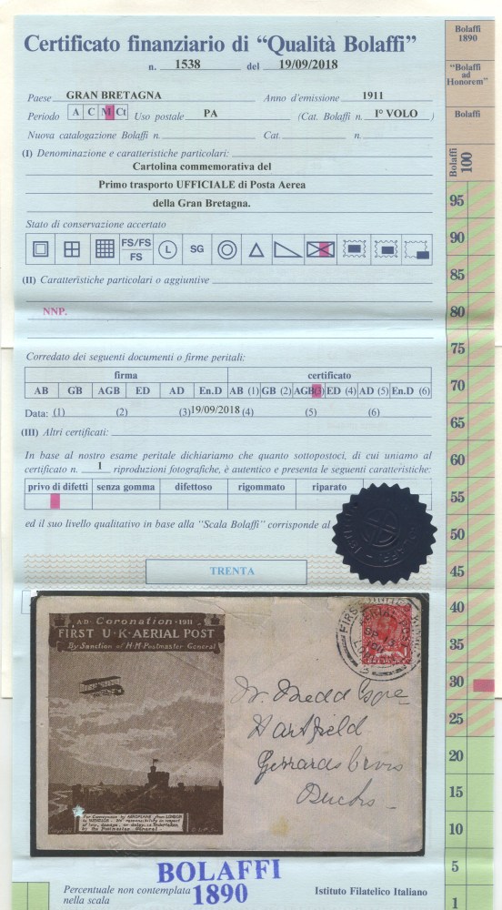 1911 - ''First U.K AERIAL POST''. Cert. finanziario Bolaffi