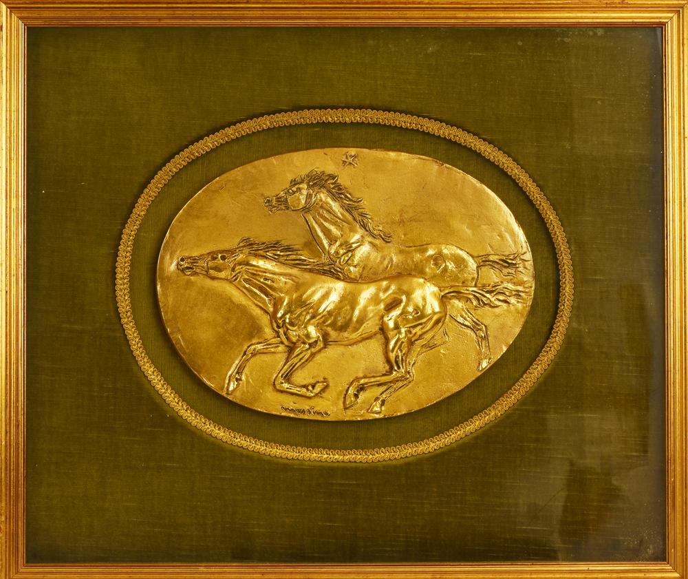 Francesco Messina CAVALLI bassorilievo su bronzo dorato ovale, cm 25x33 firma