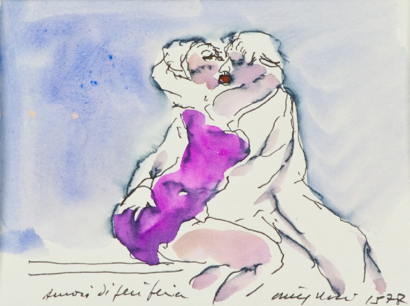 Walter Piacesi (Ascoli Piceno 1929) AMORE DI PERIFERIA, 1977 Acquerello e china su carta, cm. 12x16 Firma e data in basso a destra, titolo in basso a sinistra.