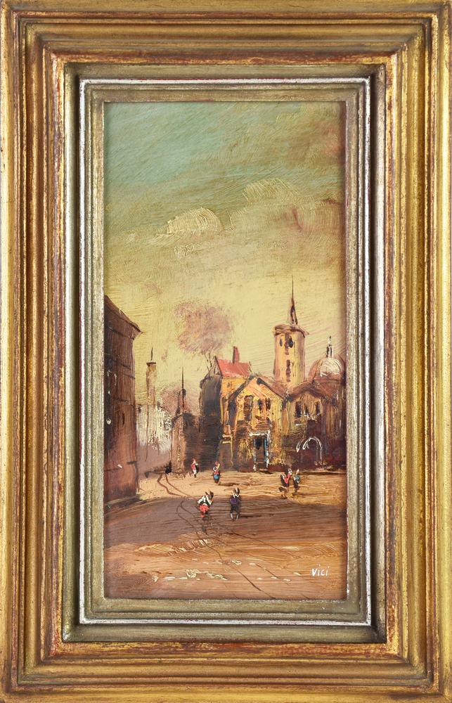 Ignoto PAESAGGIO CITTADINO olio su tavola, cm 18x9