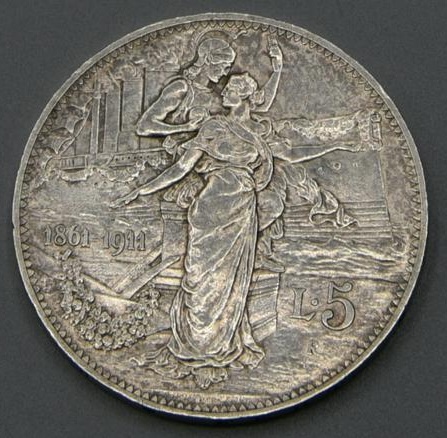 Verso: rappresentazione allegorica dell'Italia presso il monumento simboleggiante la città di Roma. Sullo sfondo una nave da guerra a vapore, a prua festoni e scudo sabaudo. A sinistra un aratro ornato con una ghirlanda di fiori a cui sono sovrapposte le date 1861-1911. A destra l'indicazione del valore e sotto l’iniziale del luogo in cui fu coniata, Roma