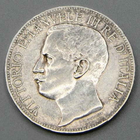 Recto: Testa del Re volta a sinistra, attorno: VITTORIO EMANUELE III RE D'ITALIA. Sotto il collo del Re i nomi dell'autore D. TRENTACOSTE (Domenico Trentacoste) e dell'incisore L. GIORGI INC. (Evaristo Luigi Giorgi)