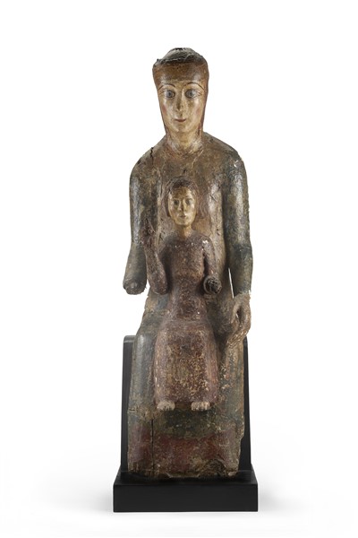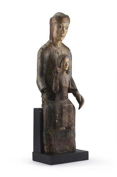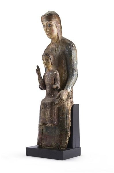 Scultore dell’Italia centrale (Umbria ?), seconda metà del secolo XIII "Madonna in Maestà col Bambino benedicente" gruppo ligneo con tracce di policromia (h. cm 87) (difetti e mancanze)