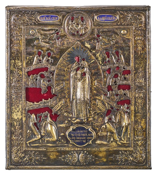 Russian art of the first half of the 19th century. "Mother of God joy of the afflicted" icon with its silver vermeil riza. Hallmarks of Mosca, 1831. Unidentified silversmith (cm max 39x34) (defects and restorations)