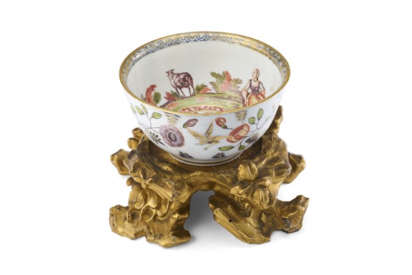 Manifattura di Meissen, 1740-1745 circa. Ciotola in porcellana policroma dipinta dalla bottega di F.J. Ferner con scene idilliache campestri e fiori policromi all'interno, esterno dipinto con rami fioriti in blu e oro. Marcata sotto la base (d. cm 17) su base in legno dorato (difetti, restauri e riprese alla doratura)