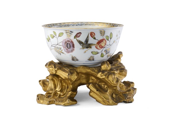 Meissen manufacture, 1740-45 circa. Polychrome porcelain bowl painted by the workshop of F.J. Marked under the base (d. cm 17) on a gilded wood base (defects, restorations and gilding)