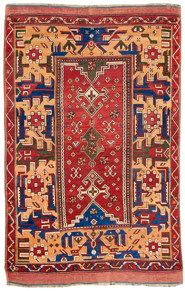 Tappeto Konya, Anatolia, inizio secolo XIX. Campo color rosso decorato da motivi stilizzati ispirati ai disegni arcaici dell'Asia centrale nei toni del bianco, verde e azzurro. Grande bordura a fondo albicocca ornata da motivi geometrici stilizzati riconducibili ai draghi caucasici armeni. Kilim originali alle testate (cm 210x137) (difetti e restauri)