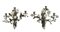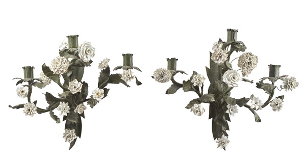 Coppia di applique a tre fiamme in tole peint verde con decoro fogliato e fiori in porcellana bianca. Piemonte, secolo XVIII (cm 38x30) (difetti)