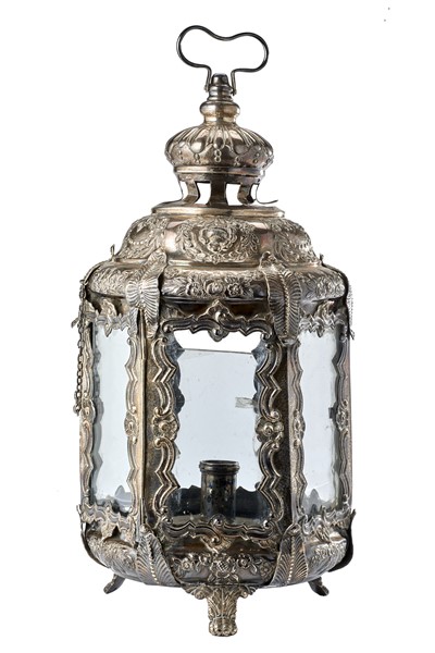 Lanterna in argento di forma esagonale con corpo interamente sbalzato a fiori, volute fogliate ed elementi stilizzati, presa ad anello, piedi ferini. Apparentemente priva di punzoni, saggio alla base. Secolo XVIII-XIX (g lordi 2800) (h. cm 47) (difetti)