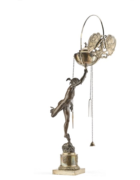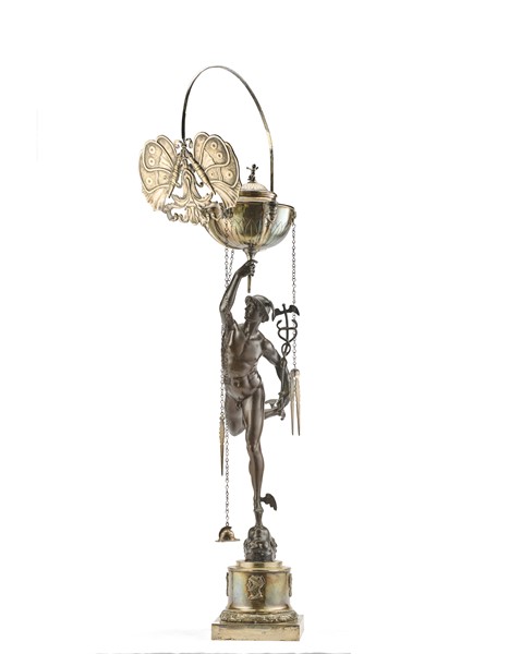 Lucerna in argento con sostegno a figura di Mercurio da Giambologna in bronzo brunito su semicolonna con profili classici e base quadrata, vaschetta con tre beccucci a volti muliebri e coperchio con presa a putto, parafiamma traforato a doppia farfalla su arco, tre attrezzi pendenti con catenelle. Roma, secolo XIX. Argentiere Filippo Pacetti (Roma, 1809-1857) (h. cm 96) (difetti)