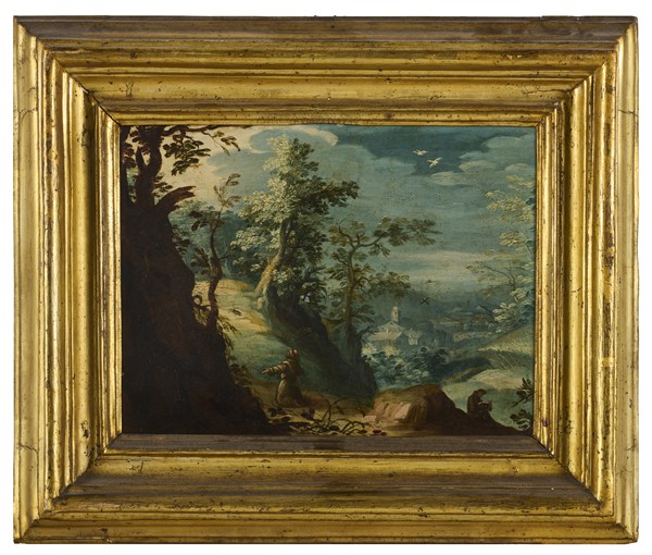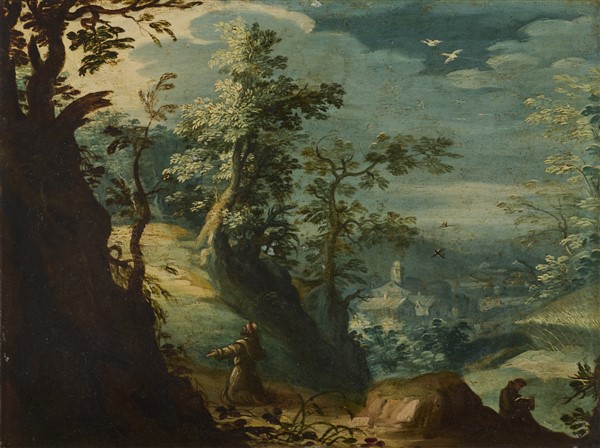 Scuola fiamminga dell'inizio del secolo XVII "Monaco in un paesaggio" e "Ripos