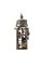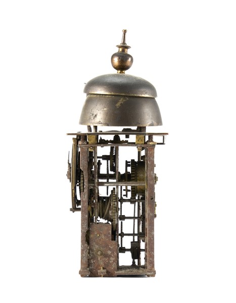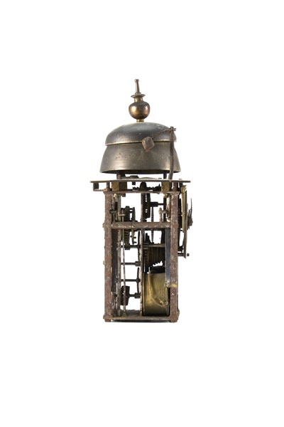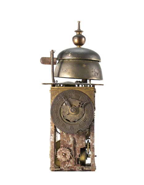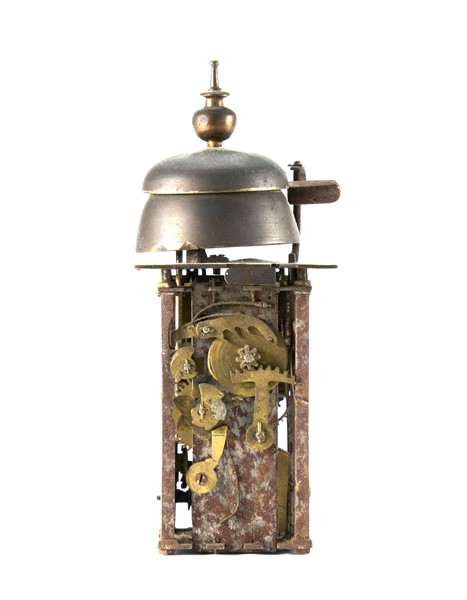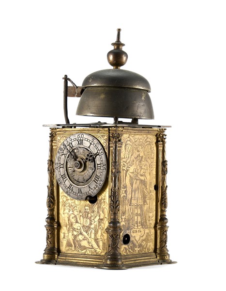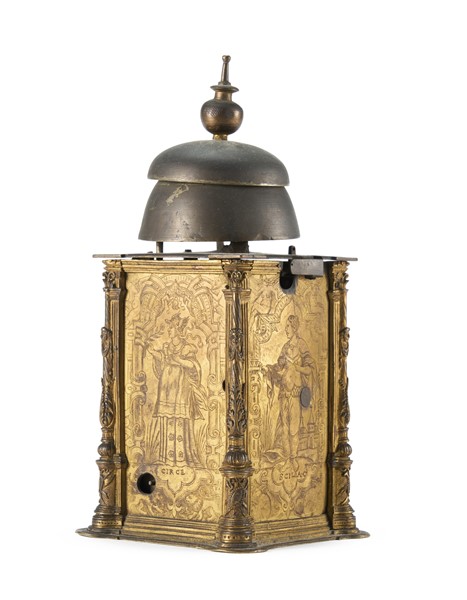 A 16th-17th century tower form gilded brass clock. Case finely engraved with mythological motifs. The two-train iron movement (heavily modified) shows hours and quarters striking on bells and alarm. Metal dial with Roman numerals for the hours and Arabic numerals for the minutes and an alarm disc (h. cm 18) (defects and replacements)