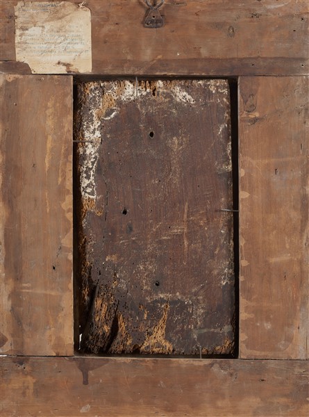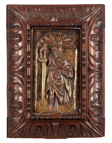 Sculptor of the 17th century. "Saint Paul" bas-relief in carved, lacquered and gilded wood (cm 35x20) in antique frame. Label on the back (defects)