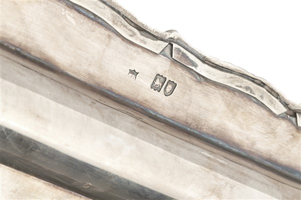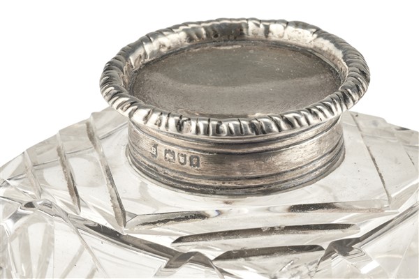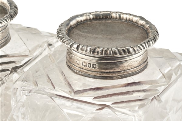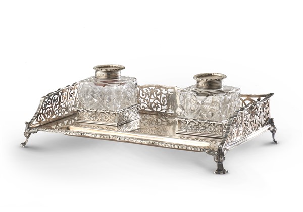 Calamaio in argento con doppio flacone in vetro molato, di forma rettangolare con ringhiera traforata. Londra, 1923. Argentiere Thomas Bradbury (cm 27x6x18) (g netti 700) (difetti)