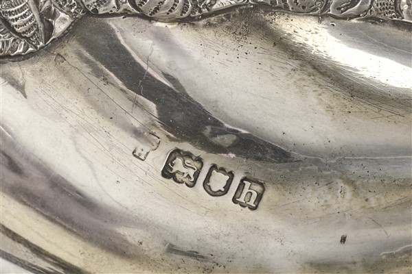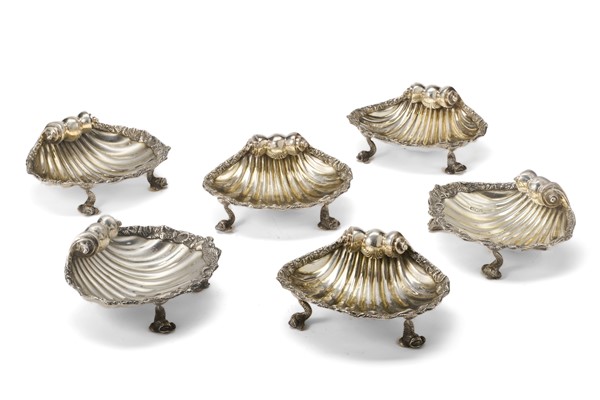 Sei ciotole in argento a valva di conchiglia con tre sostegni in forma di delfini, profilo con conchiglie a rilievo. Recanti punzoni inglesi (g 3100) (cm 16x6,5x13) (difetti)