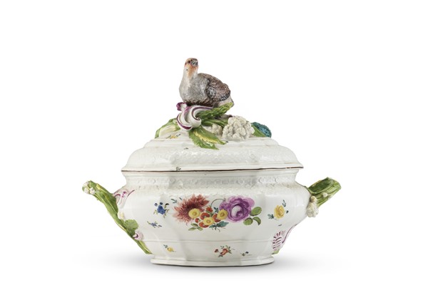 Manifattura di Meissen, secolo XVIII. Zuppiera biansata in porcellana dipinta in policromia con presa in foggia di volatile su ramo fogliato con ortaggi e frutti. Marcata sotto la base (cm 35x30) (lievi difetti)
