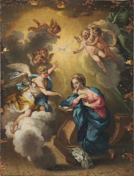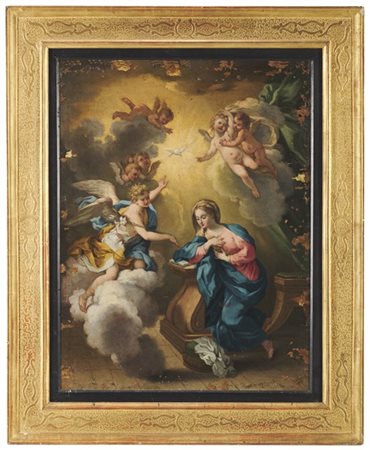 Scuola romana del secolo XVIII "Annunciazione" olio su tela (cm 65x50) in corn