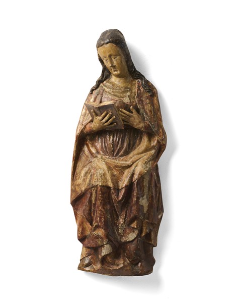Scultore del secolo XV. "Vergine annunciata" in legno intagliato e laccato (h. cm 75) (mancanze e restauri)