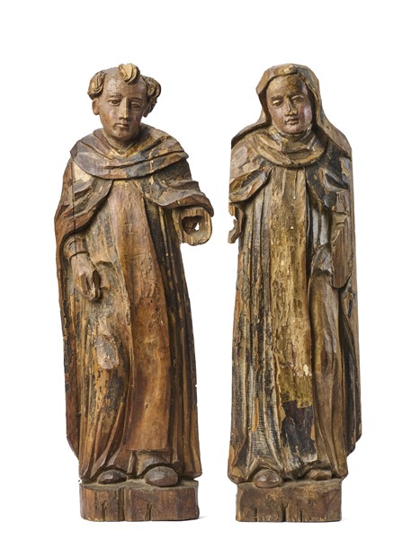 Sculptor of the 18th Century. "Saint Catherine and Saint Dominic" in carved wood with traces of polychromy (h. max cm 83) (defects)